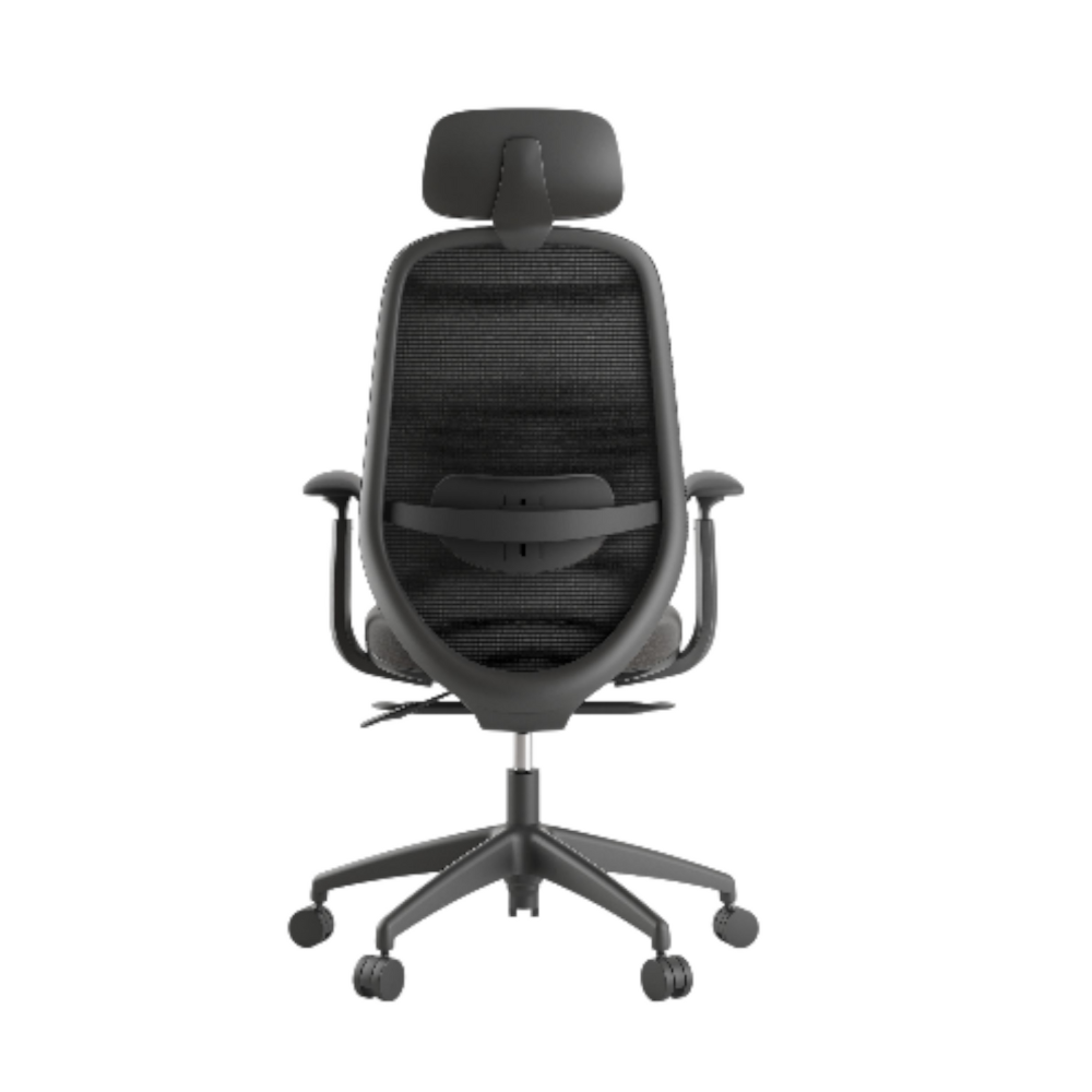Respaldo de malla con marco trasero PA + GF y soporte lumbar ajustable en altura.