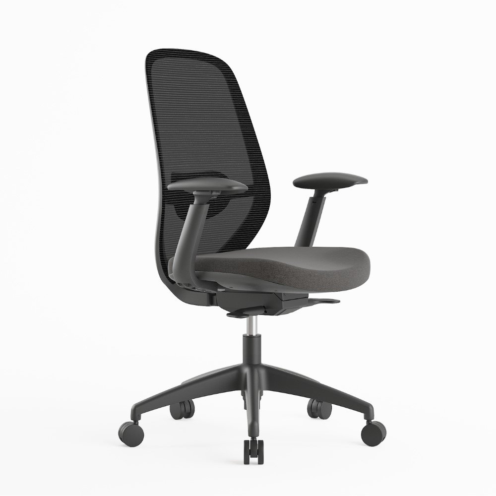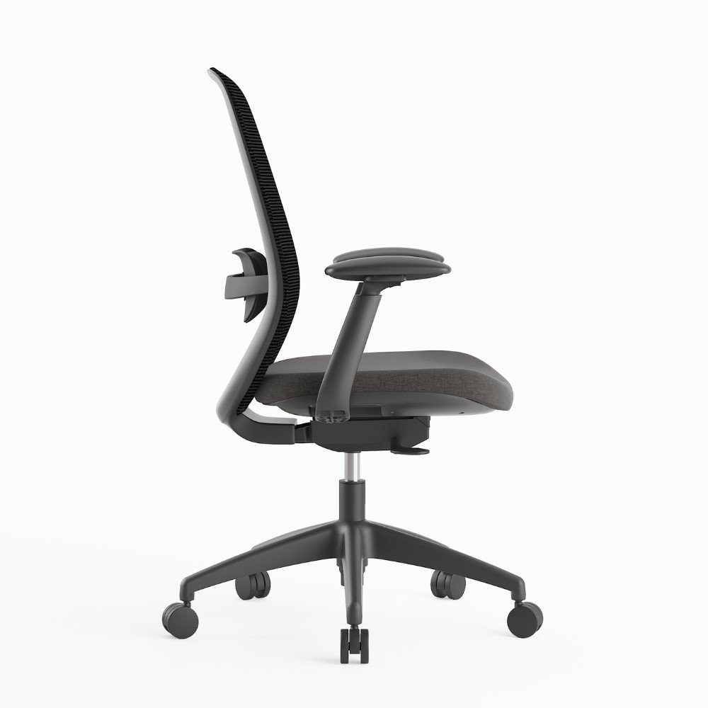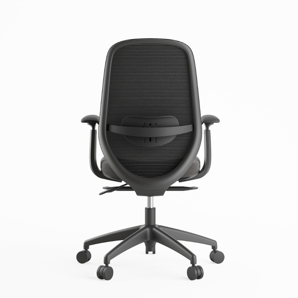 Respaldo de malla con marco trasero PA + GF y soporte lumbar ajustable en altura.