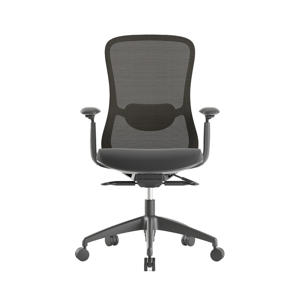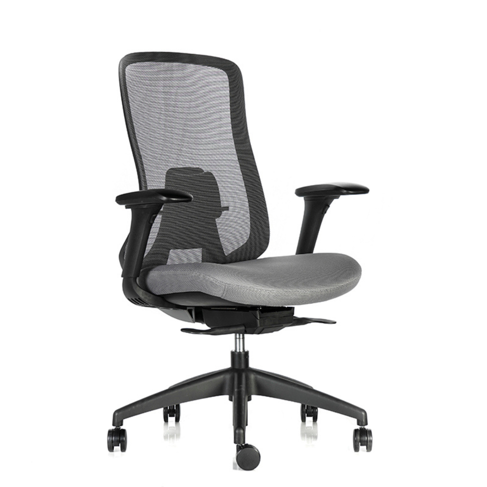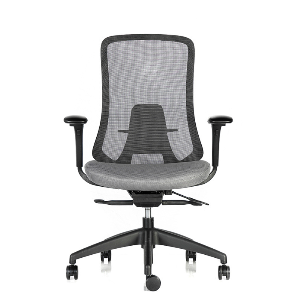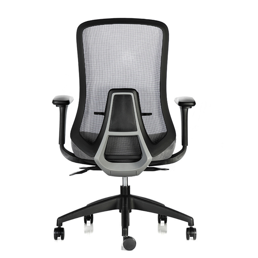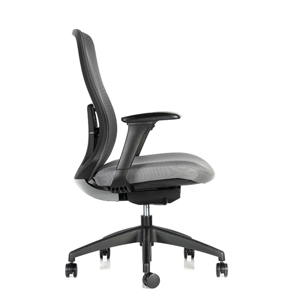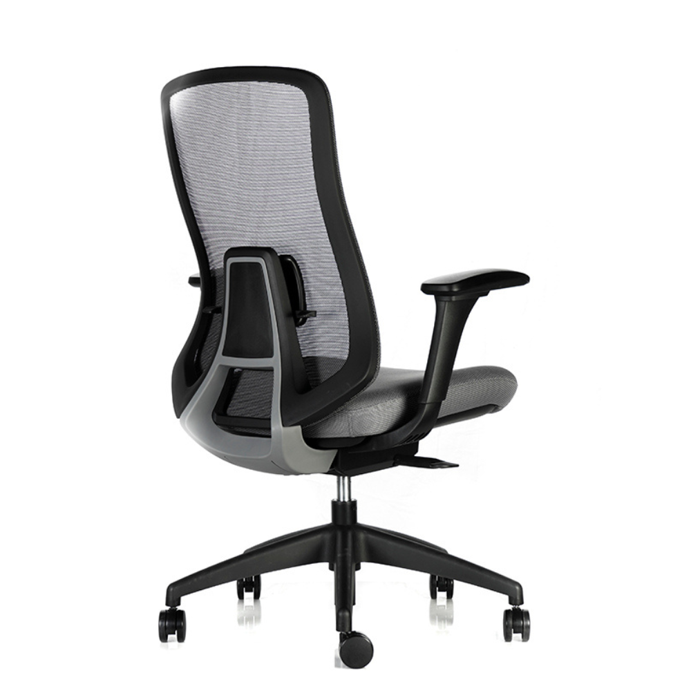 Respaldo ergonómico en malla con curvatura pronunciada.