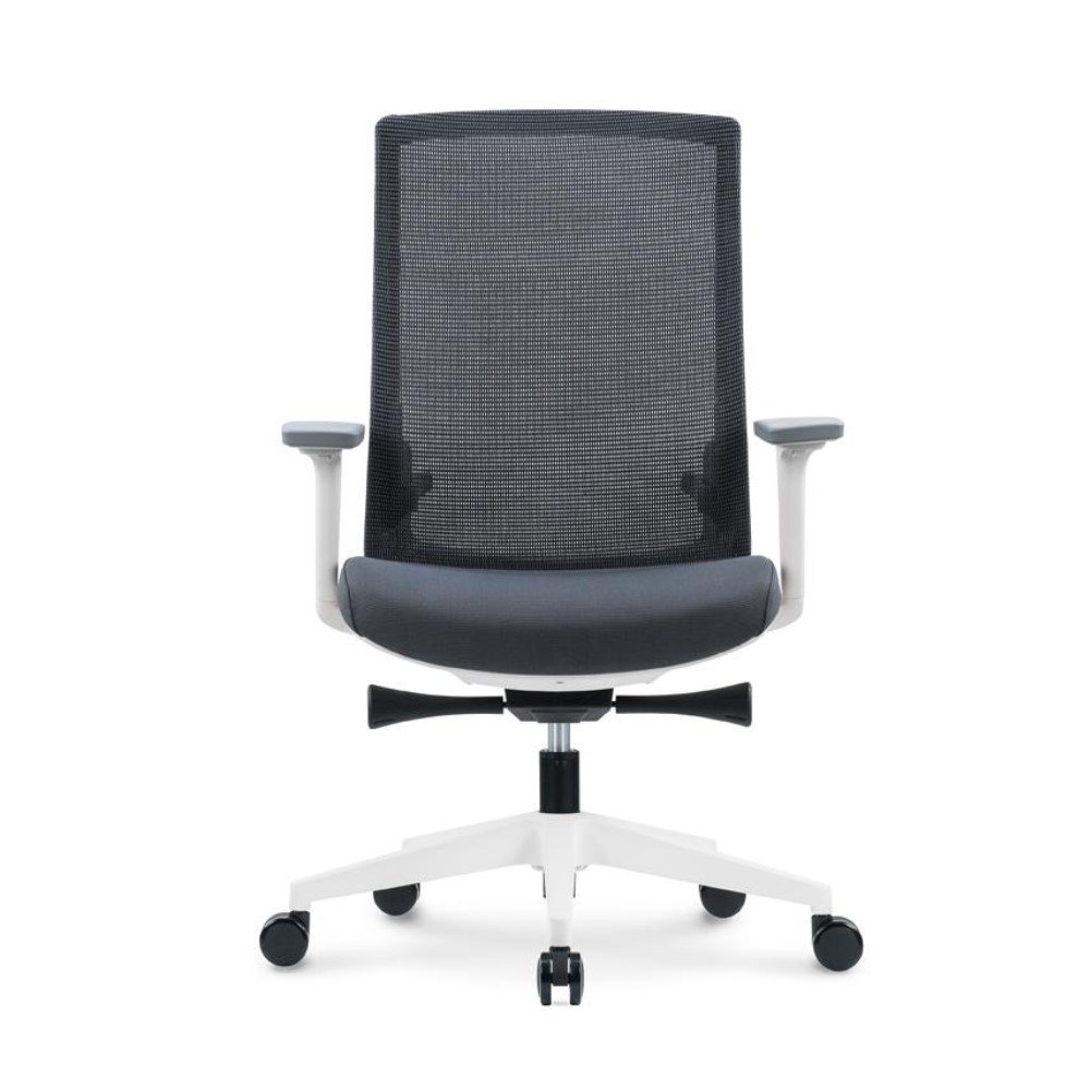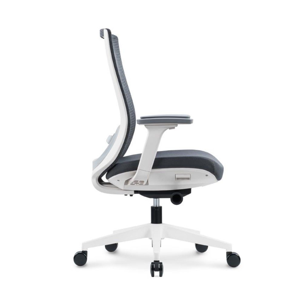 Silla Ejecutiva de estructura blanca. respaldo de malla gris.