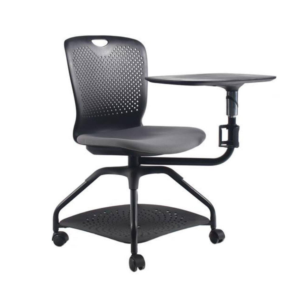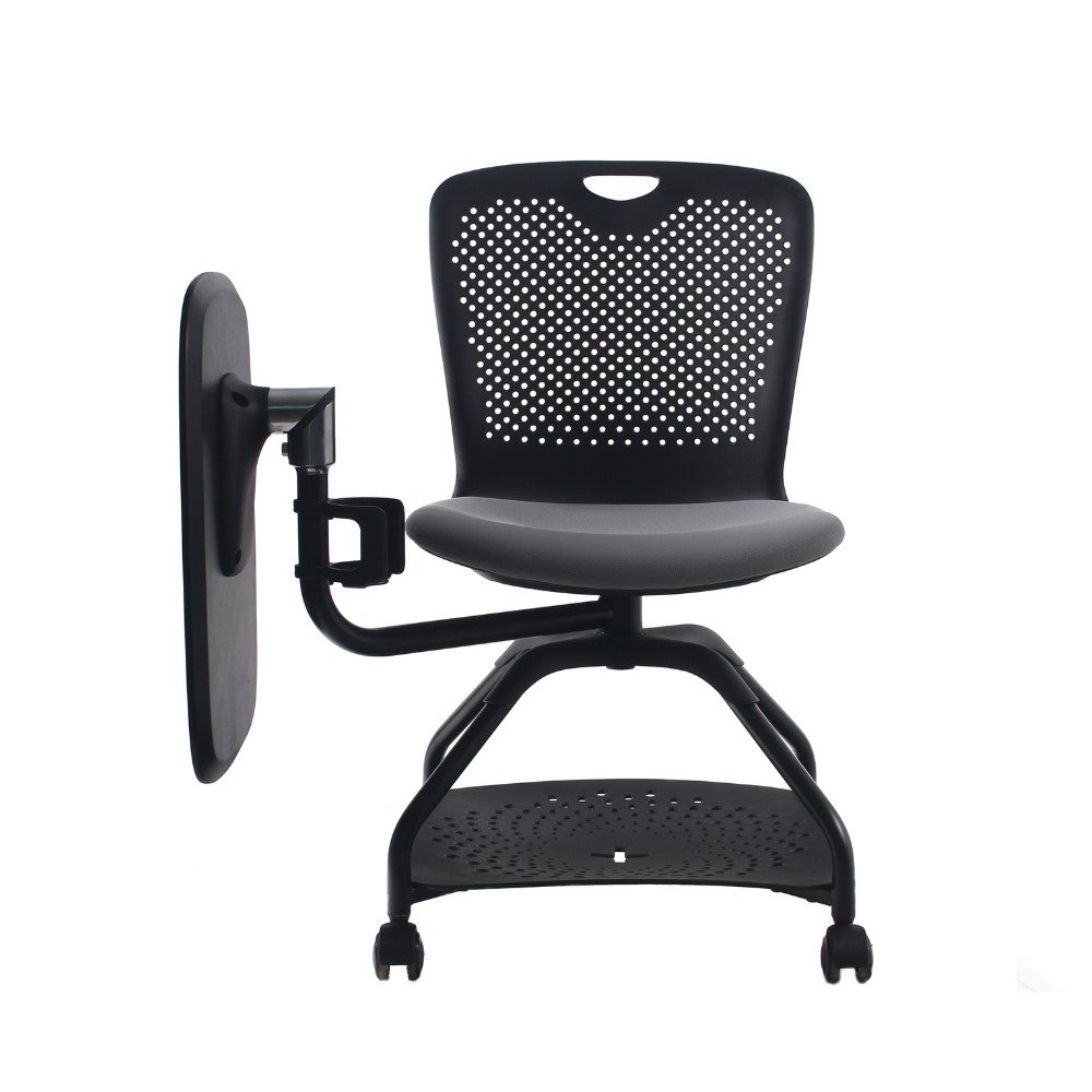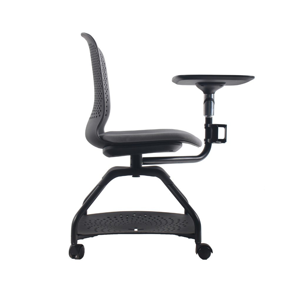 Silla con respaldo de PP negro, asiento de espuma tapizado en tela gris.